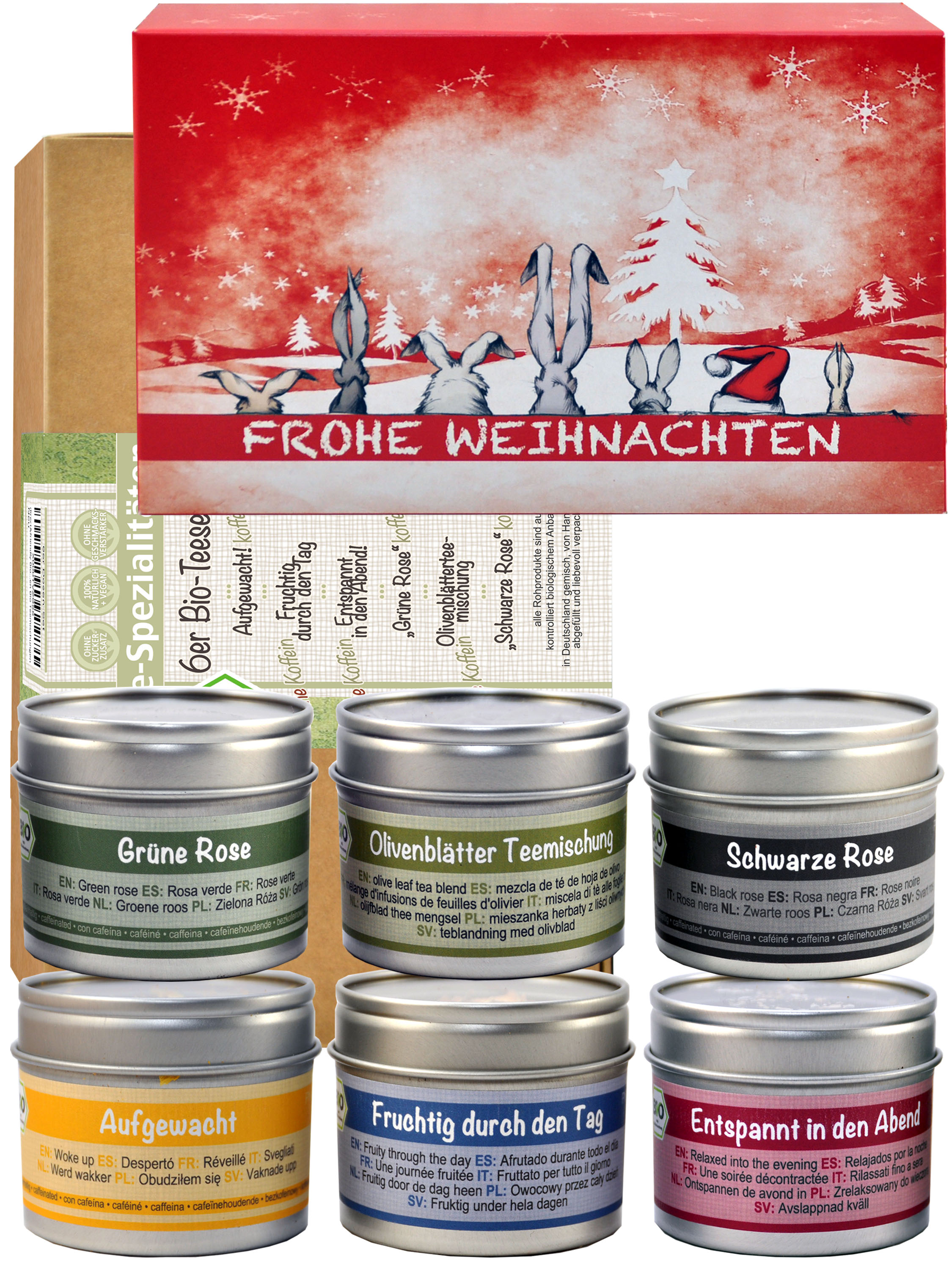 - 3 koffeinhaltige Tee-Mischungen und 3 Mischungen ohne Koffein