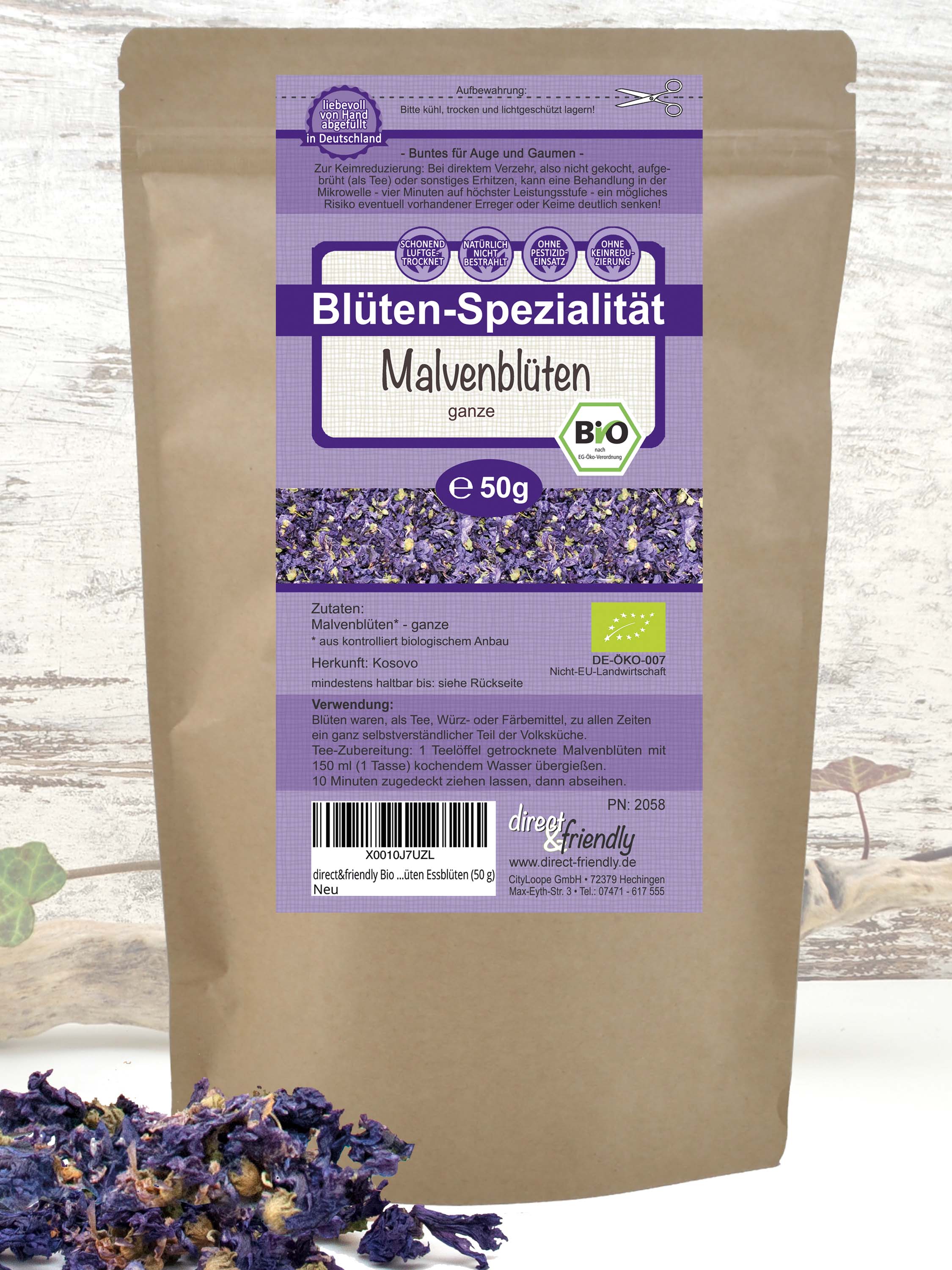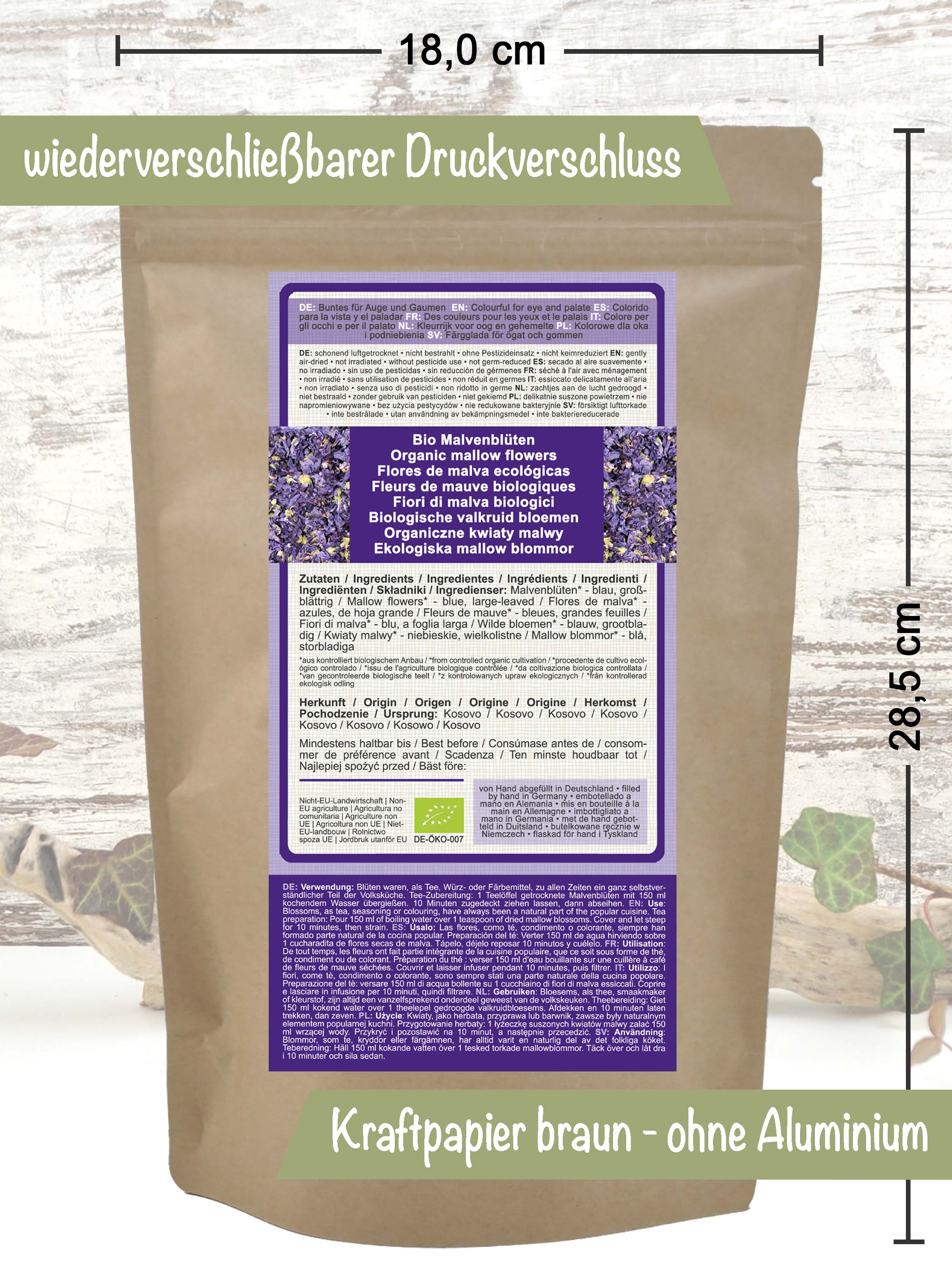 Zutaten: Malvenblüten* - blaue, ganze, großblättrige Blüten mit Kelch *aus kontrolliert biologischem Anbau