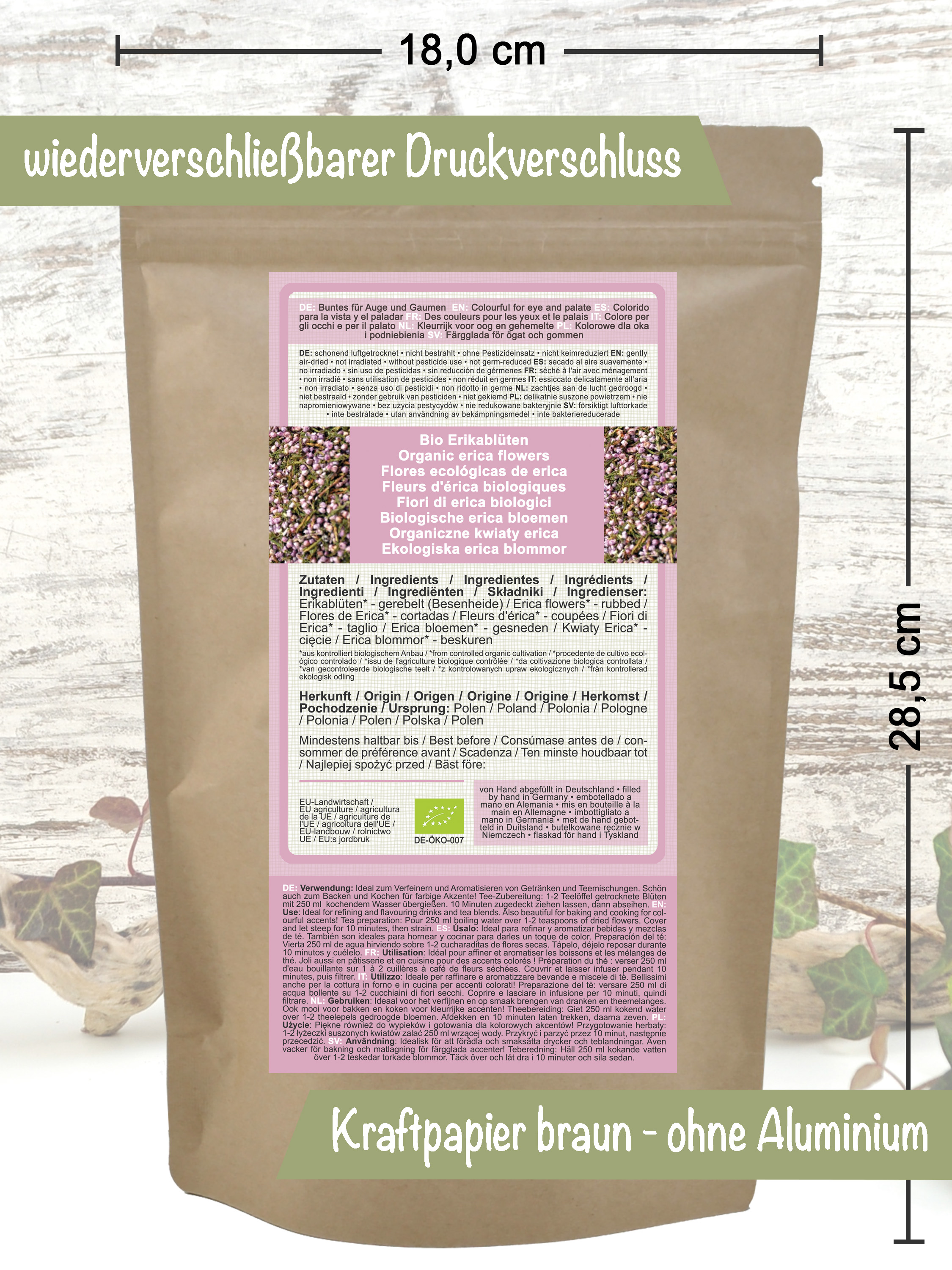 Zutaten: Erikablüten* - gerebelt, *aus kontrolliert biologischem Anbau | botanischer Name: Erica flos. | wissenschaftlicher Name: Calluna vulgaris