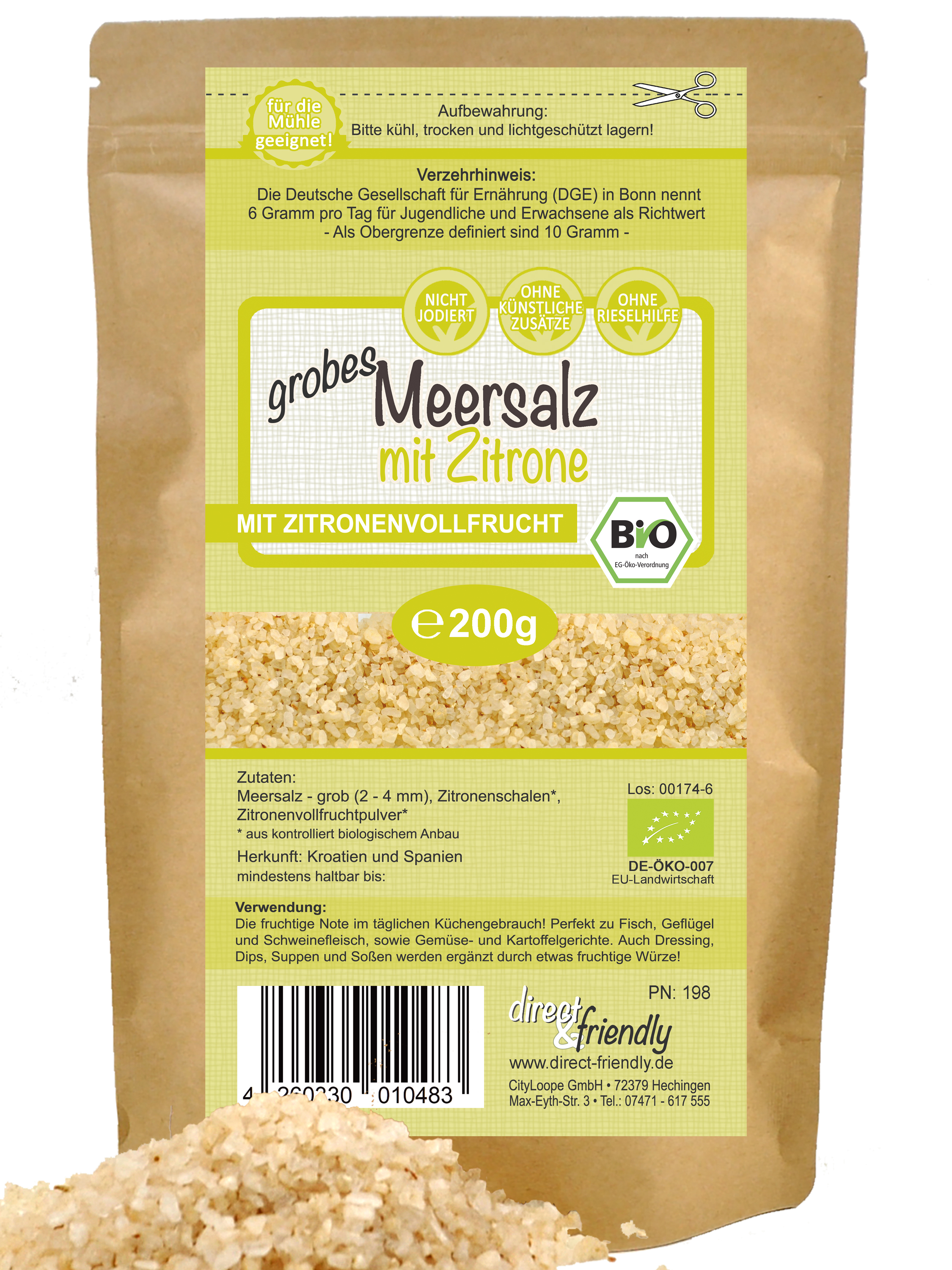Zutaten: Meersalz, grob | Zitronenschalen* Feinschnitt | Zitronenvollfruchtpulver* , *aus kontrolliert biologischem Anbau